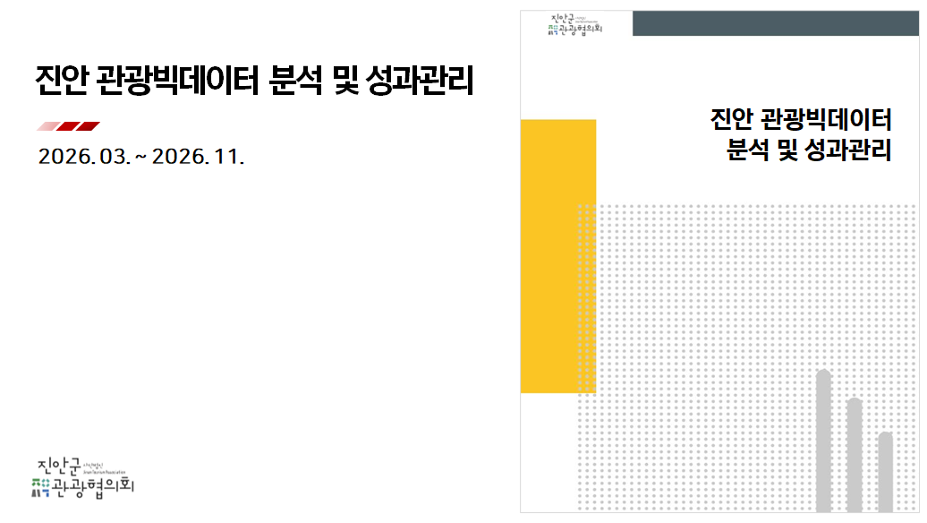 - 카드사·통신사의 빅데이터를 바탕으로 진안군 주요 관광지 유동 인구를 분석하여 행태적 특성 등 진안관광 주요 시사점을 도출- 공공 및 민간의 빅데이터를 다양하게 활용하여 현황을 다각도로 분석하고, 이를 통해 진안군 관...