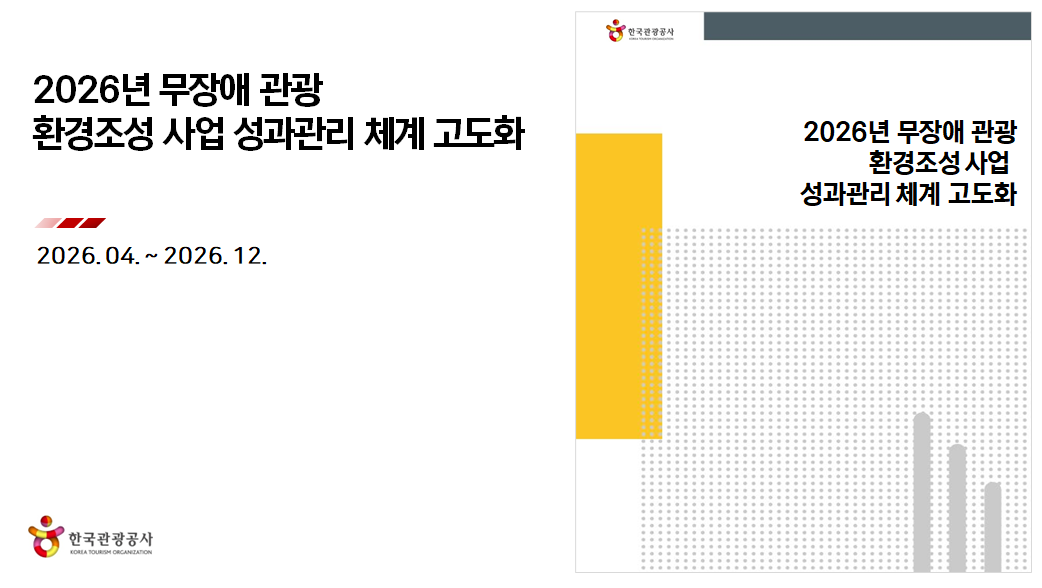 - 무장애 관광 정책사업 10주년을 맞아, 열린관광지 조성 및 무장애 관광 연계성 강화 사업 성과관리 체계 고도화를 통한 지속가능한 사업 토대 마련용역명 : 2026년 무장애 관광 환경조성 사업 성과관리 체계 고도화기&...